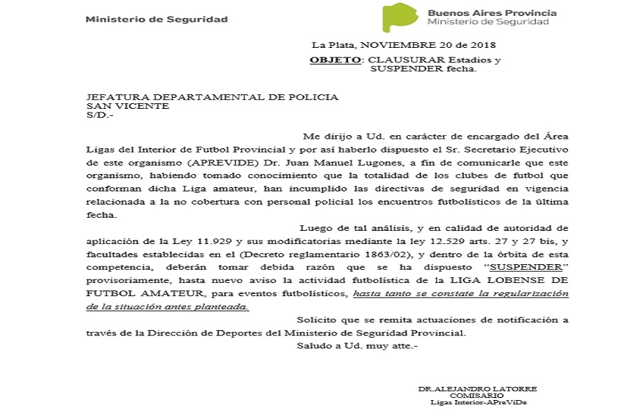 La Agencia de Prevención de la Violencia en el Deporte (APreViDe), le informó a los delegados y dirigentes de la Liga Lobense de Fútbol que la competencia esta "suspendida de manera provisoria y hasta nuevo aviso", señalaron en un comunicado que le hizo llegar el Ministerio de Seguridad bonaerense, a través del Comisario Alejandro Latorre, encargado del Área Ligas del Interior del Fútbol Provincial, a la Jefatura Departamental de San Vicente.