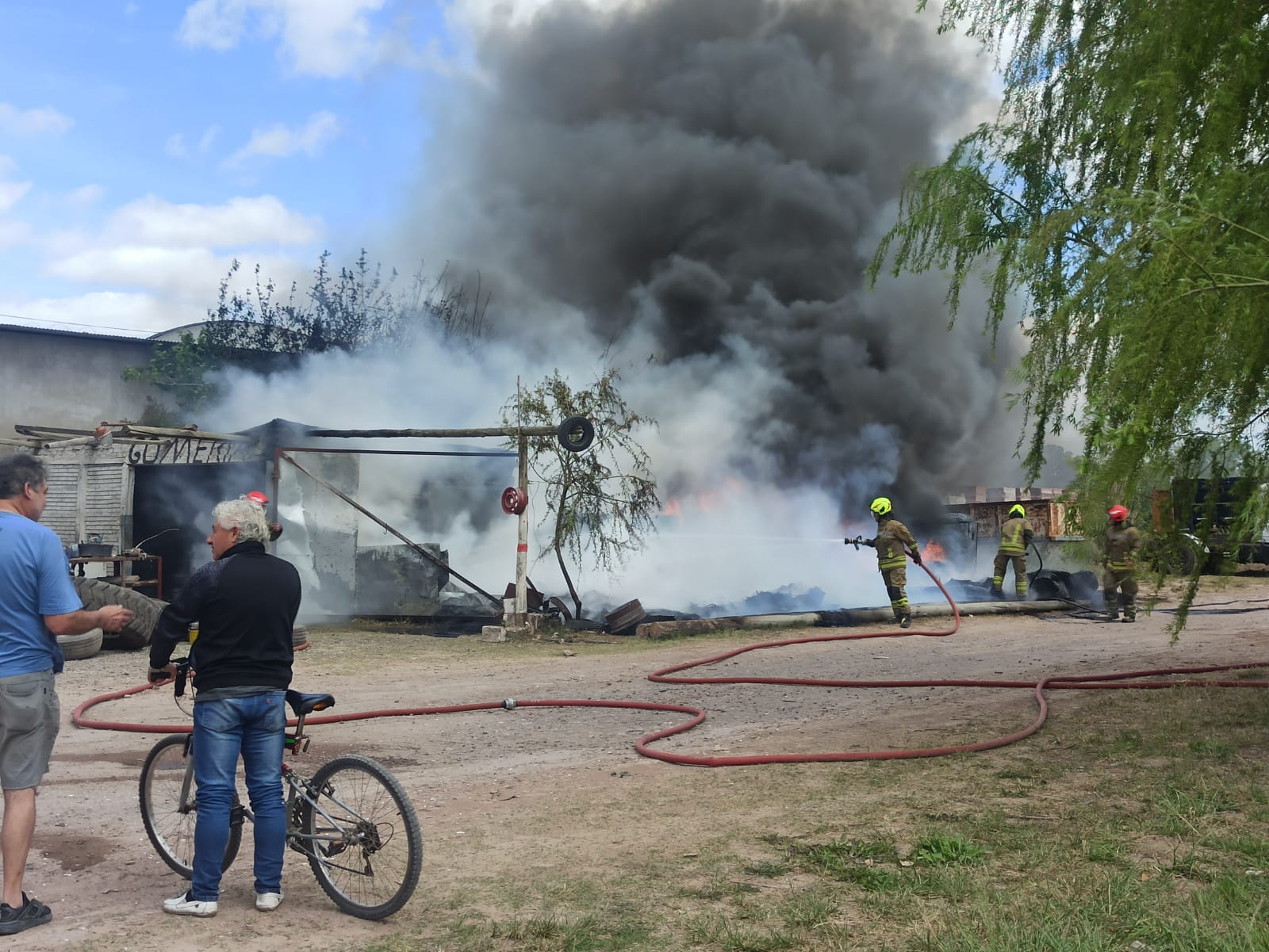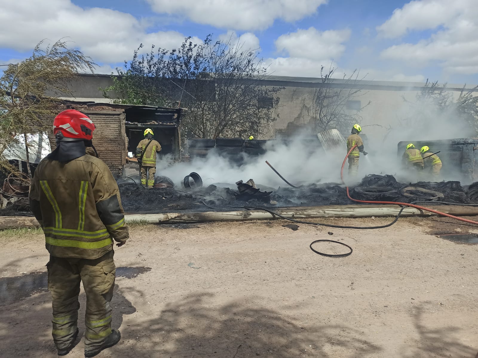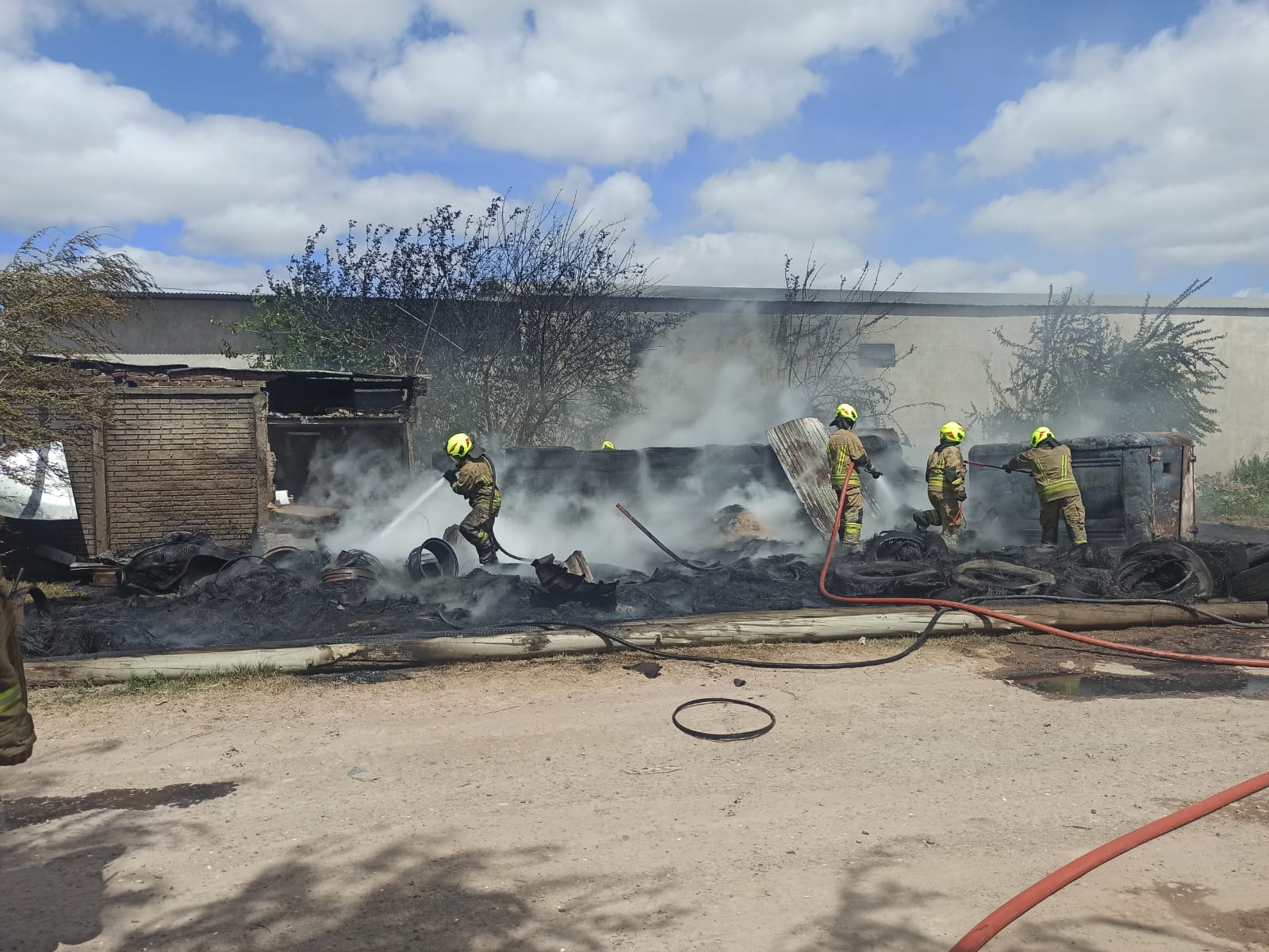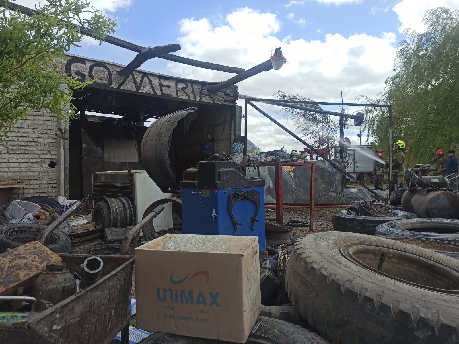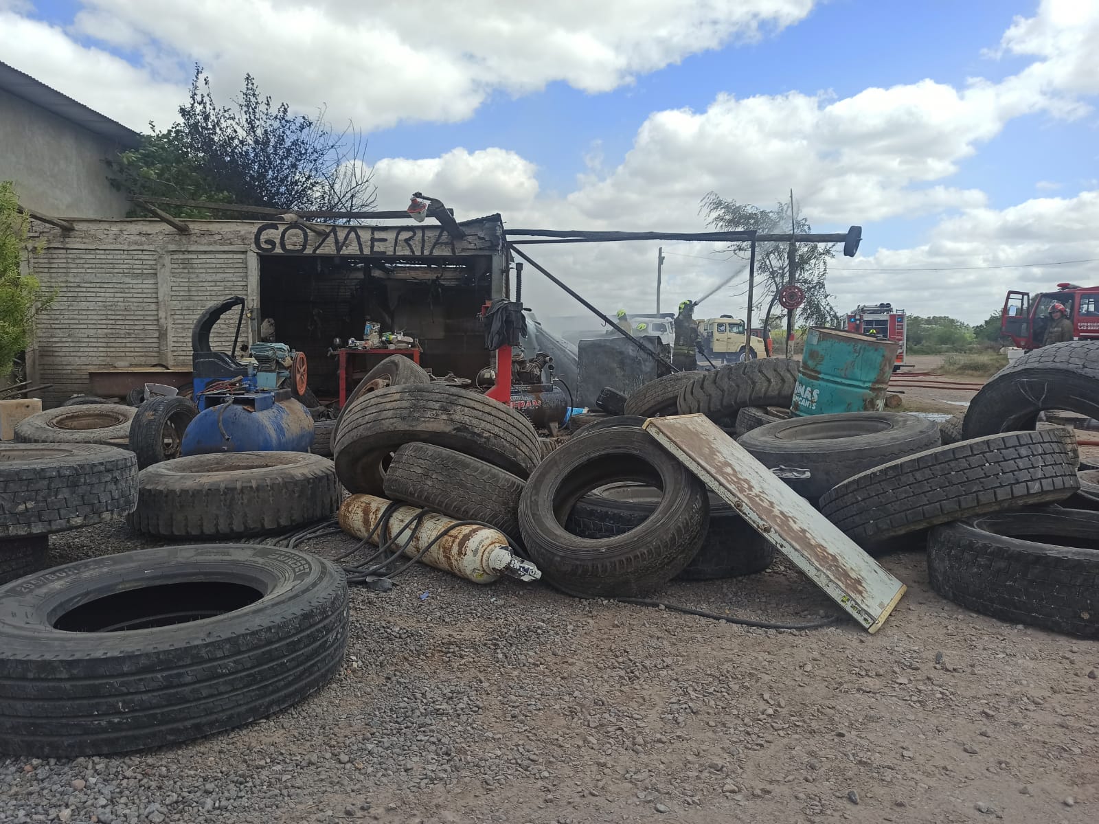 Pasadas las 10 de la mañana una montaña de neumáticos comenzó a arder en el lateral de la gomería situada sobre el Km. 65.700 de Ruta 205, a doscientos metros del acceso de Uruguay y frente a la estación de servicio YPF.