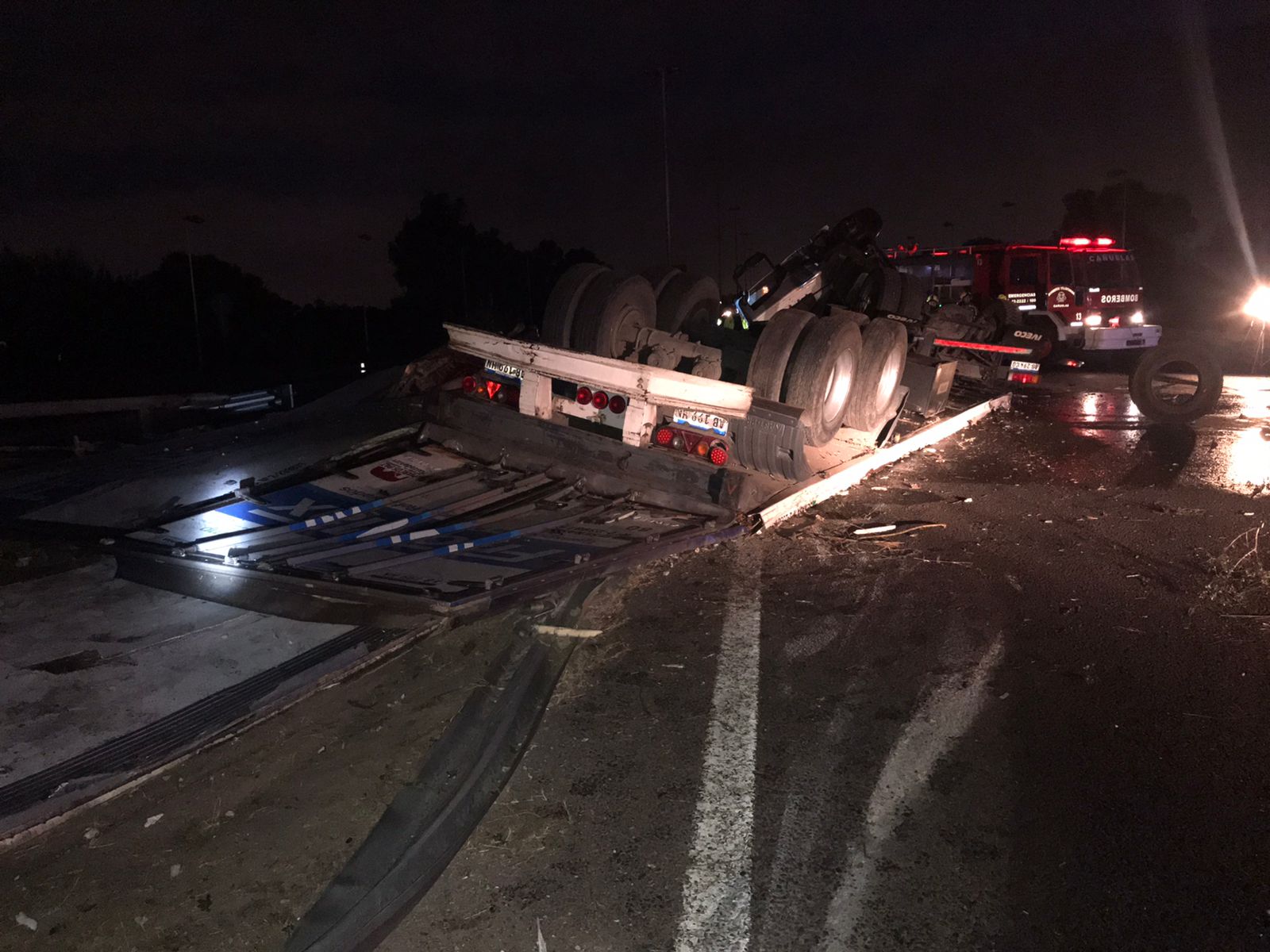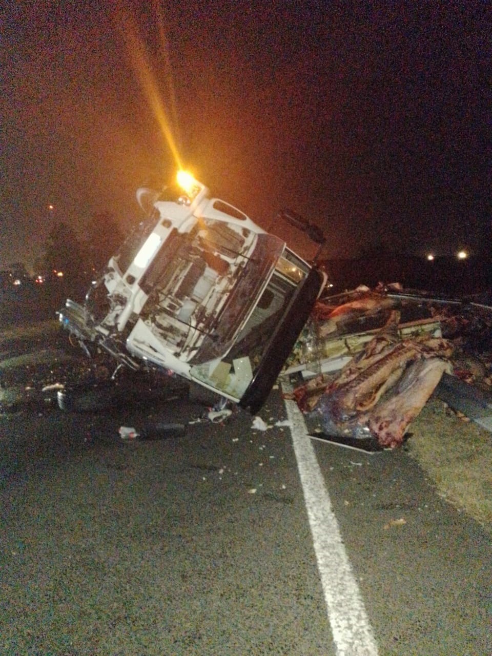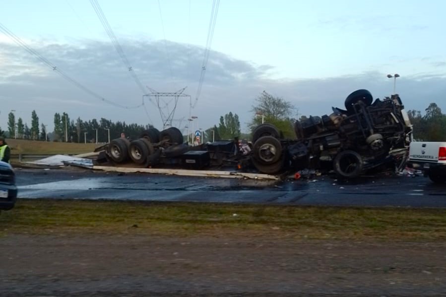En la madrugada de este martes, un camión repleto de medias reses perdió el control y volcó a la altura del Km. 54 de la autopista Ezeiza-Cañuelas, mano a la Ciudad de Buenos Aires.