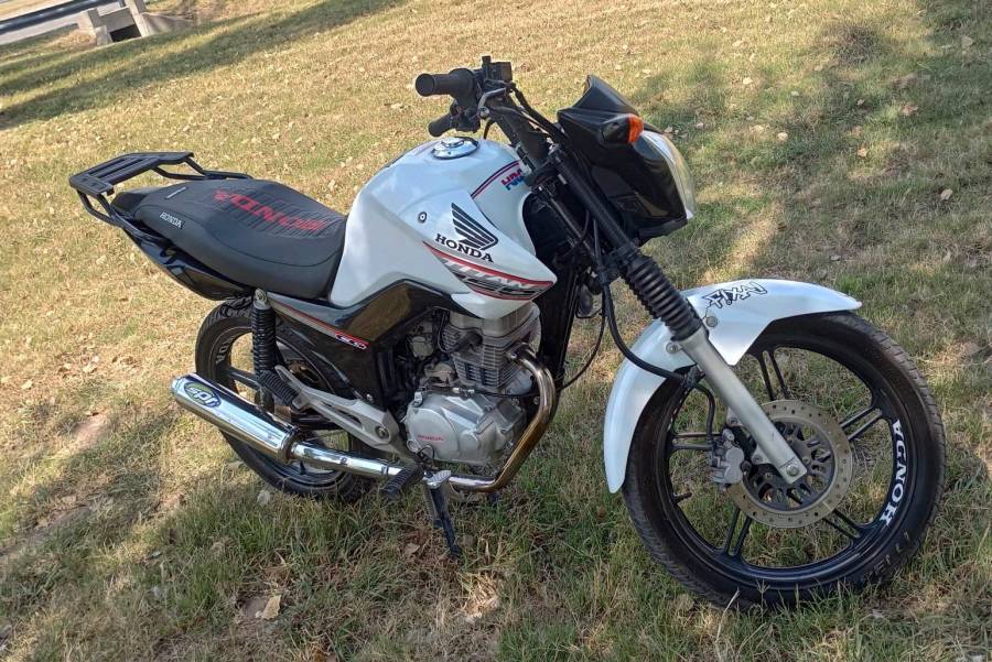 La Honda Titán de 150 centímetros cúbicos lucia inmaculada. Es de colores blanco y negro, con detalles en rojo.