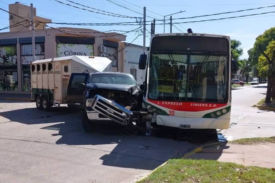 El colectivo que ingresaba a la ciudad embistió en la parte delantera izquierda a la camioneta negra que llevaba enganchado un trailer de para transportar caballos.