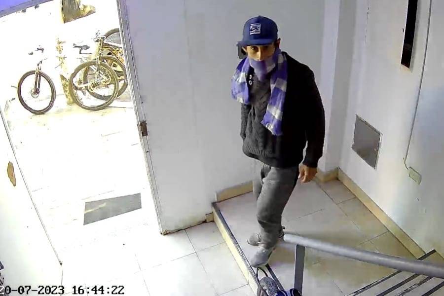 Con el hecho cocinado, el malviviente, de bufanda y gorra visera azules, vuelve a salir hacia la vereda sabiendo que sólo faltaba el zarpazo final.