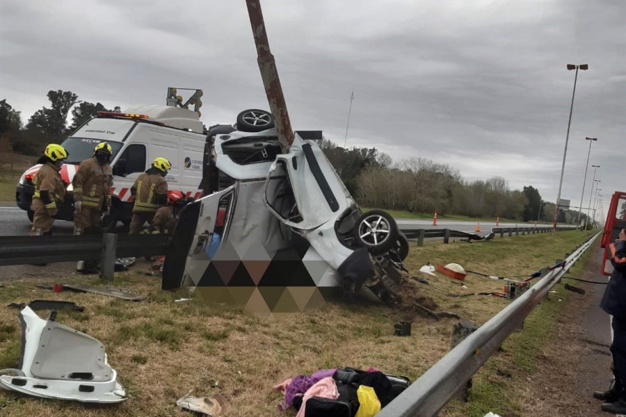 Según testigos, la camioneta que viajaba sentido a Cañuelas se despistó sola hacía el centro de la autovía, embistió el guardarrail, dio medio tumbo en el aire y terminó impactando con el techo a una columna de iluminación colocada en el boulevard.