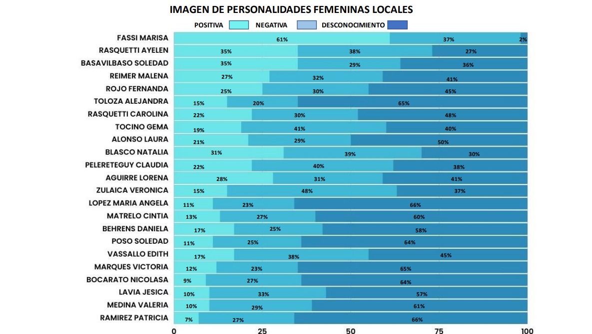 En tanto que, otra de las dirigentes oficialistas que se destaca es Soledad Basabilbaso. La titular de IOMA, es junto a Fassí, la única dirigente con mayor nivel de imagen positiva (35%) que negativa (29%).