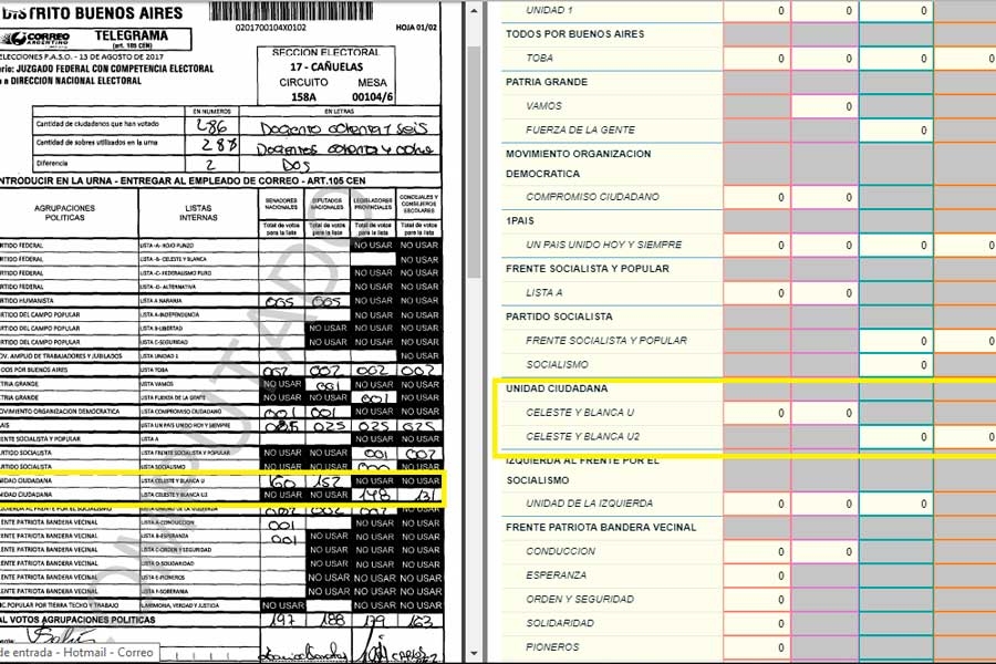 Por un lado aparecen casos como el de la mesa 120 de Uribelarrea, donde claramente se puede apreciar que el telegrama dice la cantidad de votos obtenidos, mientras que la carga realizada por el Correo en el sistema figura sin ningún voto.