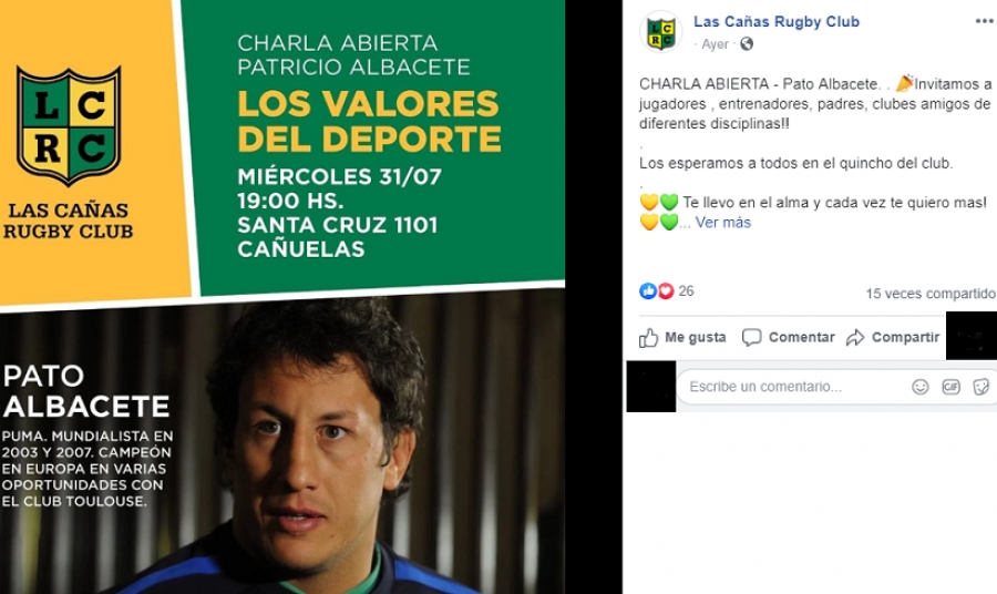 En los últimos días, el Club Las Cañas promocionó institucionalmente, con los logos y el escudo de la institución la llegada del ex jugador de Los Pumas, Patricio Albacete. Según el flyer en las redes se iba a presentar este miércoles a las 19, en el quincho ubicado en la calle Santa Cruz al 1100.