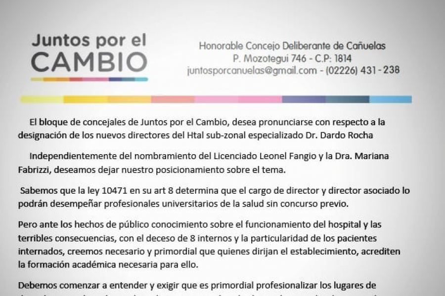 El bloque de concejales de Juntos por el Cambio se pronunció en torno a la noticia del nombramiento de Leonel Fangio y la doctora Mariana Fabrizzi en la administración del Hospital Subzonal Dardo Rocha.