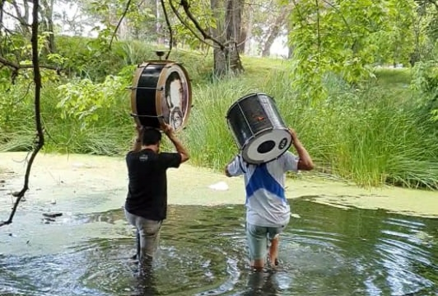 Los dirigentes del Centro Cultural Volveré, con bombo a cuesta se metieron en el agua volver a sentir lo que vivieron aquellos militantes el 17 de noviembre de 1972.