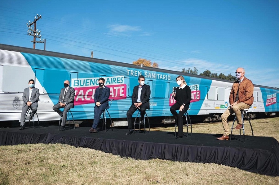En un acto desarrollado al aire libre, se dio a conocer que el tren sanitario circulará por el ramal Roca, que une la estación de Constitución con Bahía Blanca. La localidad de Vicente Casares es la primera parada del recorrido y permanecerá allí hasta mañana. Luego continuará en la estación de Cañuelas, donde estará hasta el martes 31, continuando luego en San Miguel del Monte.